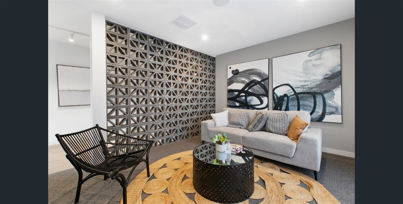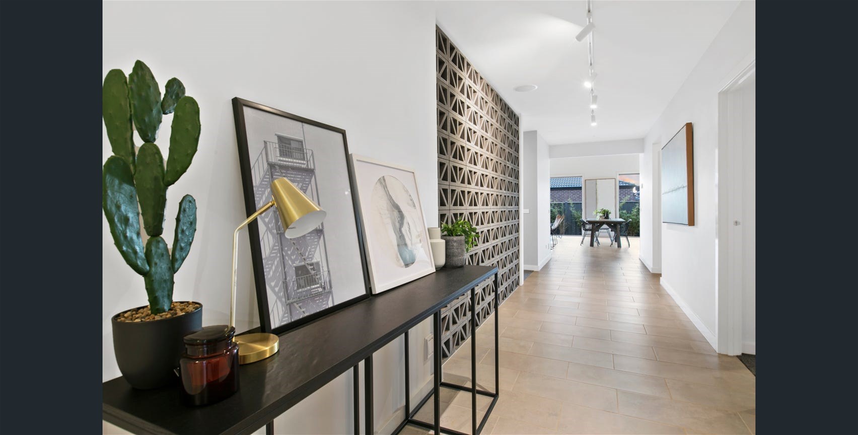 Enter the home through a wide entry wooden door into a stunning hallway with a eye-catching feature wall.